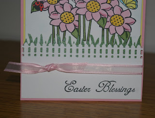 I stamped the Fly Away Hearts and Flowers (359P) and the Glowworm sentiment (1048G) in Versamark ink and sprinkles White Embossing Powder over it and heat embossed the image. I used Prismacolor Pencils and a Signo White Gel Pen to color in the flowers and hearts. I stamped the Glowworm (1044D) in Tuxedo Black Memento Ink and color him using Prismacolor Pencils. I cut him out and popped him up with Glue Dots. I added a strip of white card stock along the top and White Satin Ribbon along the bottom. I used the Viva Pearl Pen Clear to add the three dots in the corner.