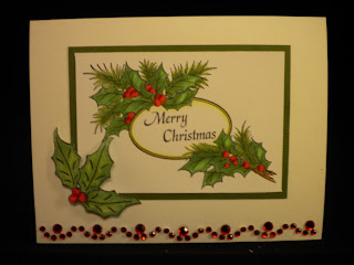 The card base is cream with a layer of cranberry. On top of the cranberry is a layer of darker cream that was embossed with the CB snowflake folder. The sentiment was stamped in black on the cream card stock, cut with a square nestie and layered on a scalloped square nestie cut out of the cranberry. Some ribbon and a couple of holly leaves punched with a MS punch finishes the look. I did add some lace stickles to the holly berries.