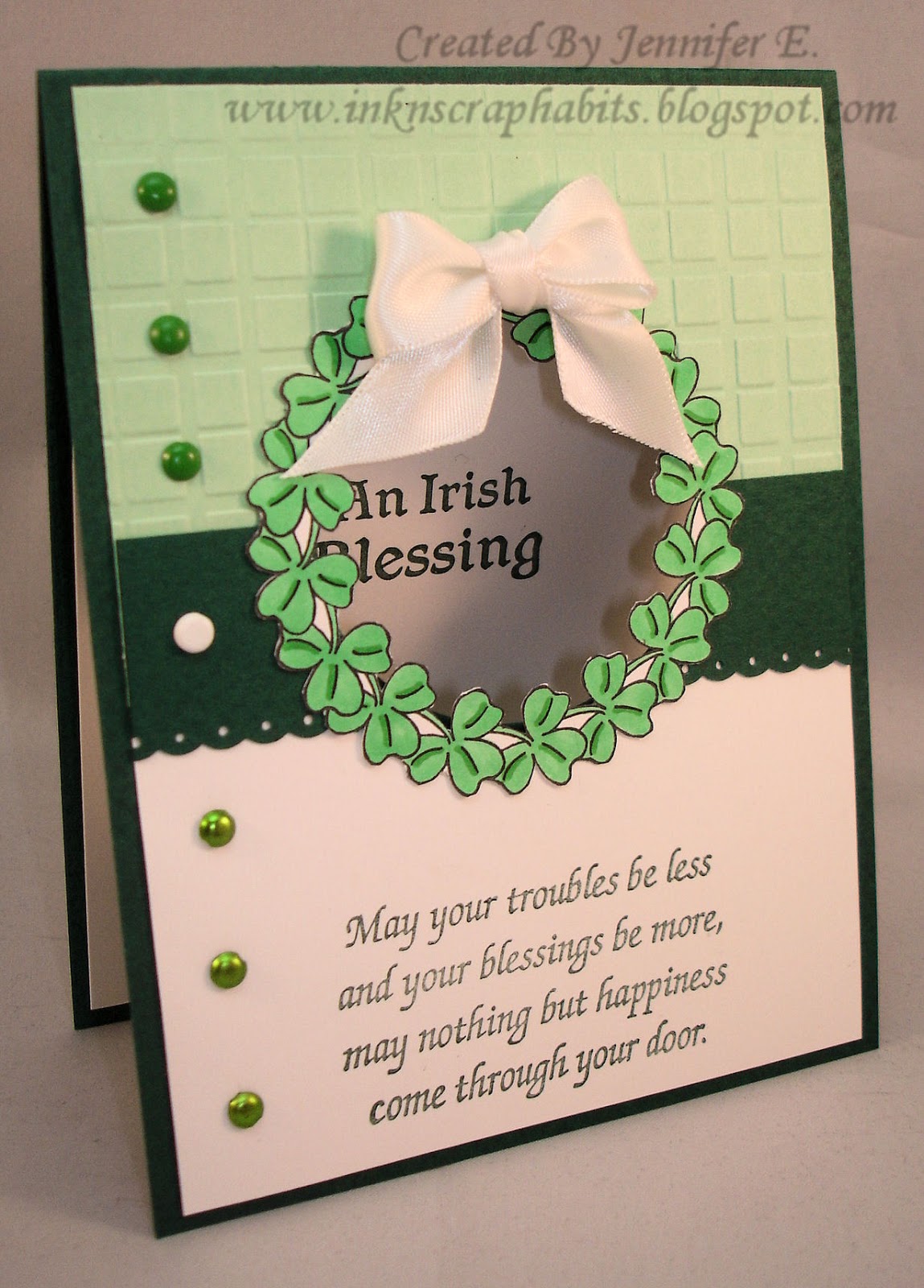 It's getting closer to the time of the wearin' o' the green! Not a problem for me...green (any shade) is my fave color and my Mom's side of the family is almost totally Irish. At least I didn't inherit her red hair and freckles, lol. We traced her side of the family back to County Meath, Ireland and found they came over in the 1600's to settle in Virginia. Their grandson, my Great (x 5) Grandfather fought in the American Revolution and turns out he's buried about 15 minutes away from me.