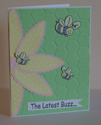 I created my background by sponging Barely Banana, Bashful Blue and Certainly Celery inks in random stripes all over a piece of white CS. Once the inks dried, I stamped the Textured Butterfly in VersaMark ink several times, added clear embossing powder and heat embossed the images. Old Olive ink was then sponged all over the CS. I used a paper towel to remove the ink from the embossed butterflies. I love how the blue, yellow and lighter green inks show up! The Feeling Better greeting was stamped with black ink on white CS along with a few barely banana butterflies, die cut and layered on a scalloped So Saffron oval. Before attaching it to the card, I punched a yellow strip with a MS punch and added it to the card along with a few tiny half pearls. Everything was then layered on a piece of the yellow CS and then attached to the white base.