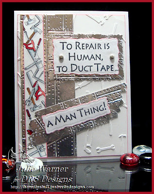 So for my Man Thing card, I wanted to use duct tape, but could only find some dark almost black duct tape around here, so I used some foil tape (don't know what it's used for but it's in the home improvement section) and stuck it to a piece of card stock and embossed it. I used some lg deckle scissors on the ends of the Man Thing part to look more like torn duct tape. The tool border was colored w/ Copics and I just happened to have a tool bg embossing folder to finish it off. The finished card is 4.25 x 5.50.