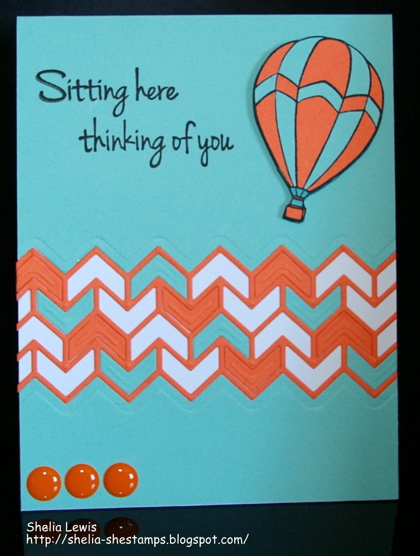 The hot air balloon was stamped on both the blue and orange CS. I used the blue as the base of the balloon and fussy cut the orange pieces and glued them into place. The balloon was attached with foam dots for some dimension. Orange enamel dots complete the look.