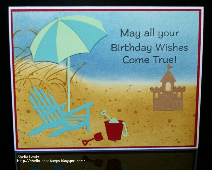 (use any image, die cut or punched shape, paper, technique, but make it a beachy theme..or something you'd find on a beach, like palm trees, bikinis, seashells, seagulls, etc.